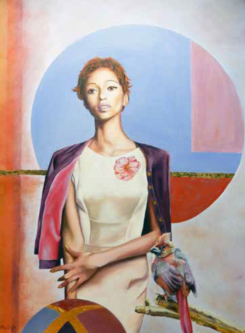 De derde prijs gaat naar Marianne van Dijk. Zij verrukte ons met dit uitstekende werk van een mooie vrouw, uitgevoerd in olieverf en bladgoud. De dame kijkt iets weg van de toeschouwer, maar de vogel houdt ons scherp in de gaten. De techniek die Marianne laat zien is vaardig en de achtergrond met grafische elementen complementeert de compositie prima. De kleuren zijn volgens Marianne geïnspireerd op het verenkleed van de vogel. Dit is volgens ons een uitstekende keuze gebleken!